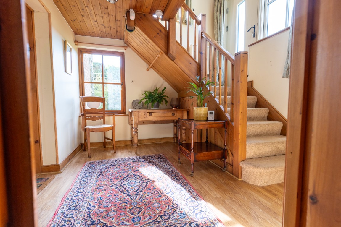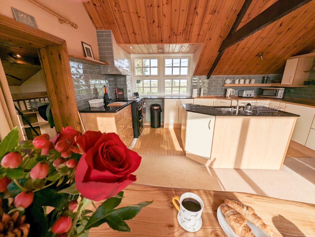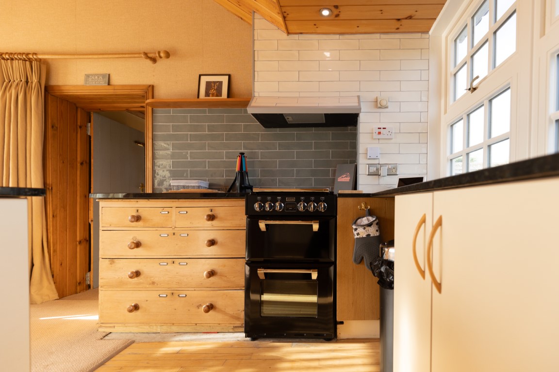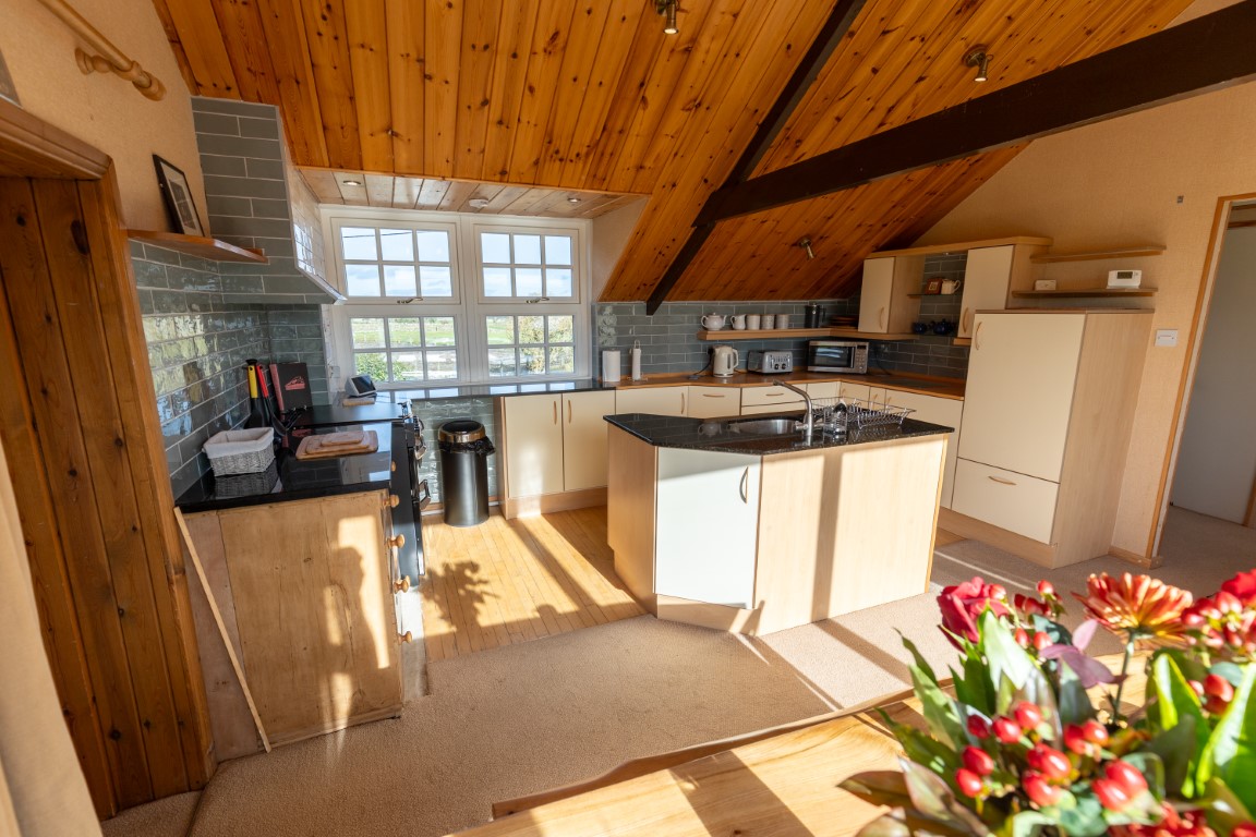 Stairs take you up to the kitchen which has floor to ceiling windows running the whole width of the room. A unique dining table, handcrafted from a local ash tree, comfortably seats six and is an excellent vantage point for taking in the views. You can listen to your favourite music or podcasts on the Alexa Echo Show. The kitchen is well equipped with a new Stoves cooker and a new dishwasher. Granite and wood work surfaces provide plenty of room for food preparation and you will find everything you need whether it’s making a snack, cooking a Sunday lunch or even baking.
