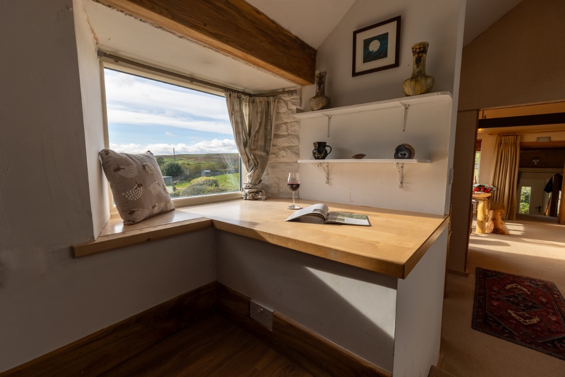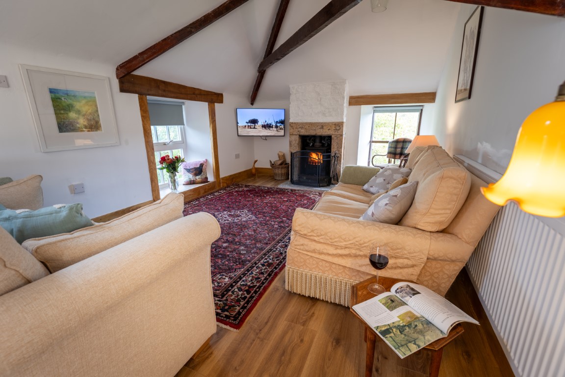In the adjoining lounge is a multi-fuel stove, plenty of comfortable seating, a smart TV (WIFI is provided), and more lovely views from the cottage windows.