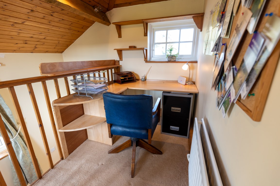 Tucked next to the kitchen at the top of the stairs is a cosy office space.